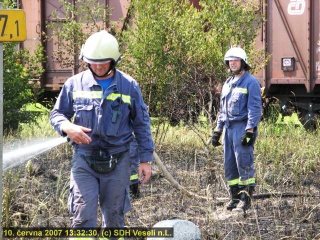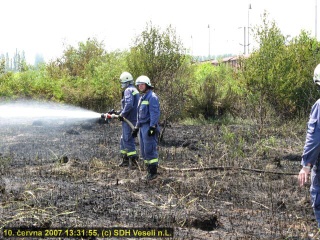 Další požár trávy a náletových křovin u vjezdu do veselského nádraží hasili v neděli 10.června 2007 odpoledne členové zásahové jednotky SDH Veselí n.L. spolu s jednotkou HZS České dráhy Č.Budějovice.