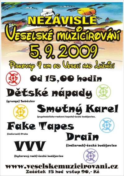 Luděk Lou Myler na první zářijovou sobotu připravil na parkovišti u pískovny další díl svého festiválku, tentokrát pod názvem Nezávislé Veselské muzicírování. V 15 hodin zahájí soběslavská grungeová kapela Dětské nápady a pak postupně v dvouhodinových intervalech vystoupí muzikanti, které jsme zatím ve Veselí ještě neměli možnost slyšet. Od 17 hodin to bude českobudějovické indierockové seskupení Drain. V 19 hodin vystoupí se svým kytarovým rockem další budějičáci – VVV. Ve 21 hodin zahájí svůj set další indierocková kapela Fake Tapes, která přijede z Prahy (a jen tak mimochodem – kluci právě dokončili svůj nový klip a přestaví jej v pátek 4.9. na ČT v pořadu Události v kultuře). Celý festival bude ve 23 hodin ukončen vystoupením ve Veselí již dobře známé českobudějovické psychedelicko-rockové partičky Smutný Karel. Vstupné na akci je 90,- Kč.