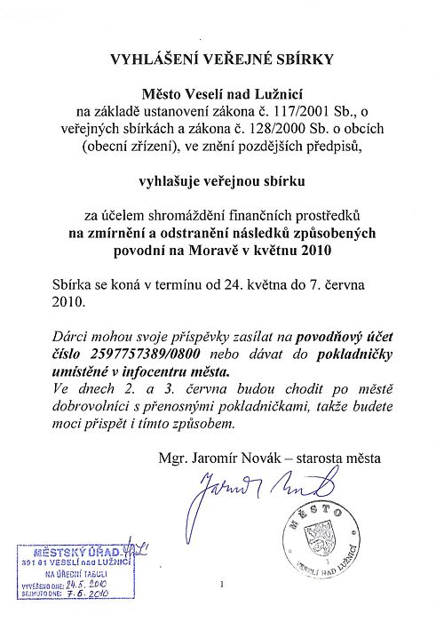 Veselí vyhlašuje povodňovou sbírku na pomoc Moravě25. května 2010, Obec , přečteno 4340x, komentováno 2x