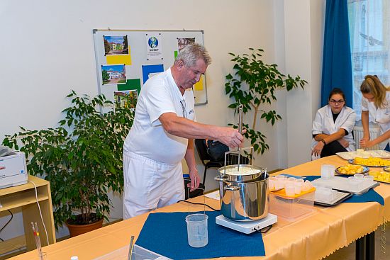 Pan Josef Pánek, ředitel závodu Madeta Řípec, představil žákům nejkrásnější mlékárenský obor – sýrařství. Seznámili se s výrobou čerstvých smetanových sýrů z pasterovaného mléka, sami si vyzkoušeli nalévání sýrového zrna do tvořítek a formování sýřeniny. Praktickou ukázku technologie doplnil pan Pánek zajímavým vyprávěním o historii sýrů a o rozmanitosti jejich druhů. Sýry, které vyrábí Madeta, mohli žáci díky našemu největšímu mlékárenskému podniku ochutnávat během celé prezentace.