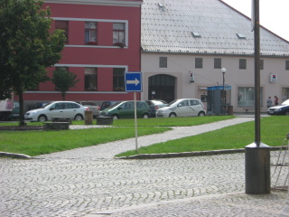 Na náměstí T. G. Masaryka, proti vchodu do budovy radnice, je už delší dobu zvláštní dopravní značka. Informativní značka „Jednosměrný provoz“ pootočená o devadesát stupňů.